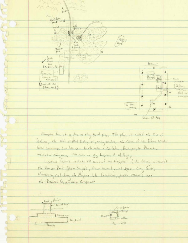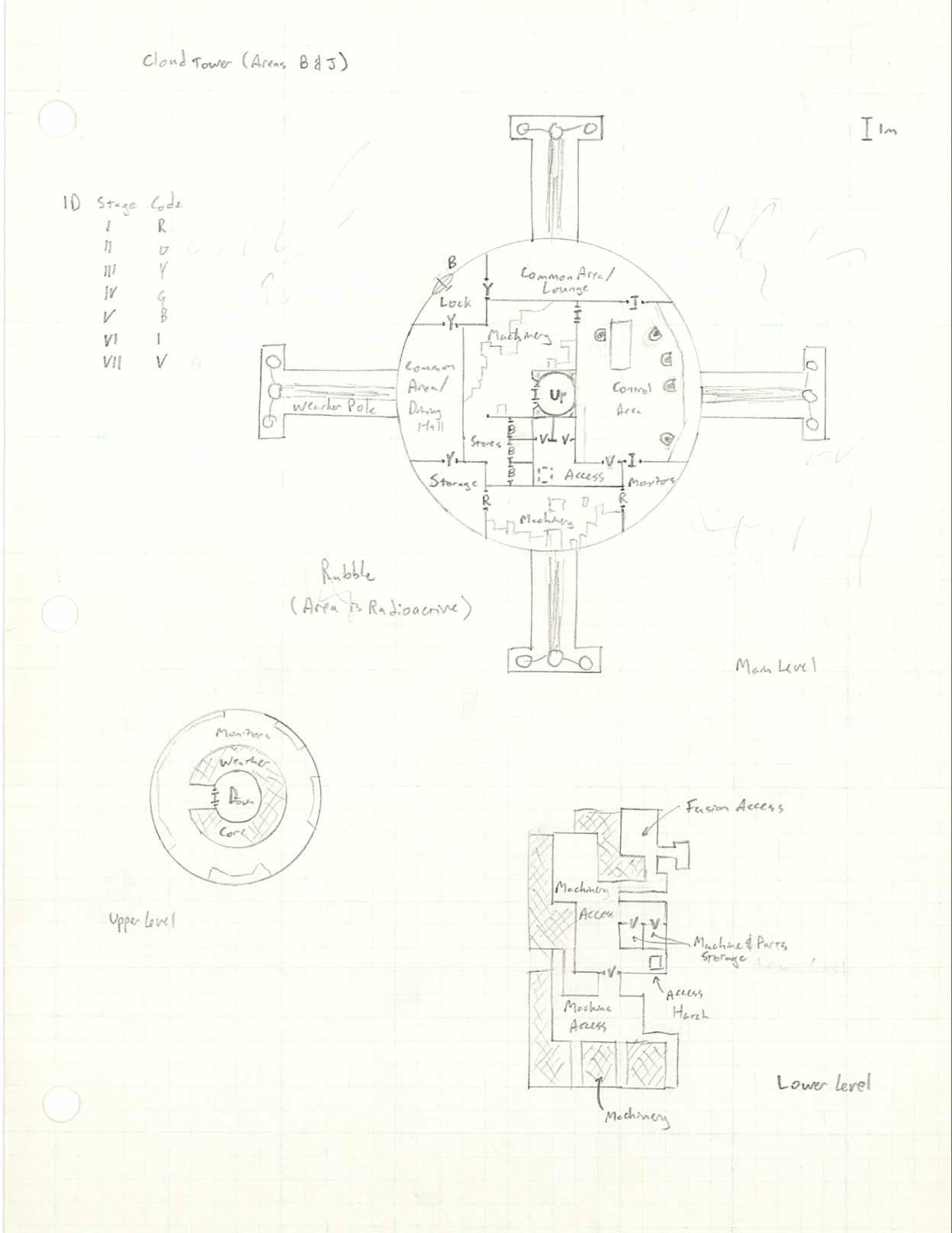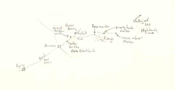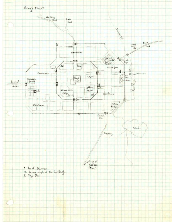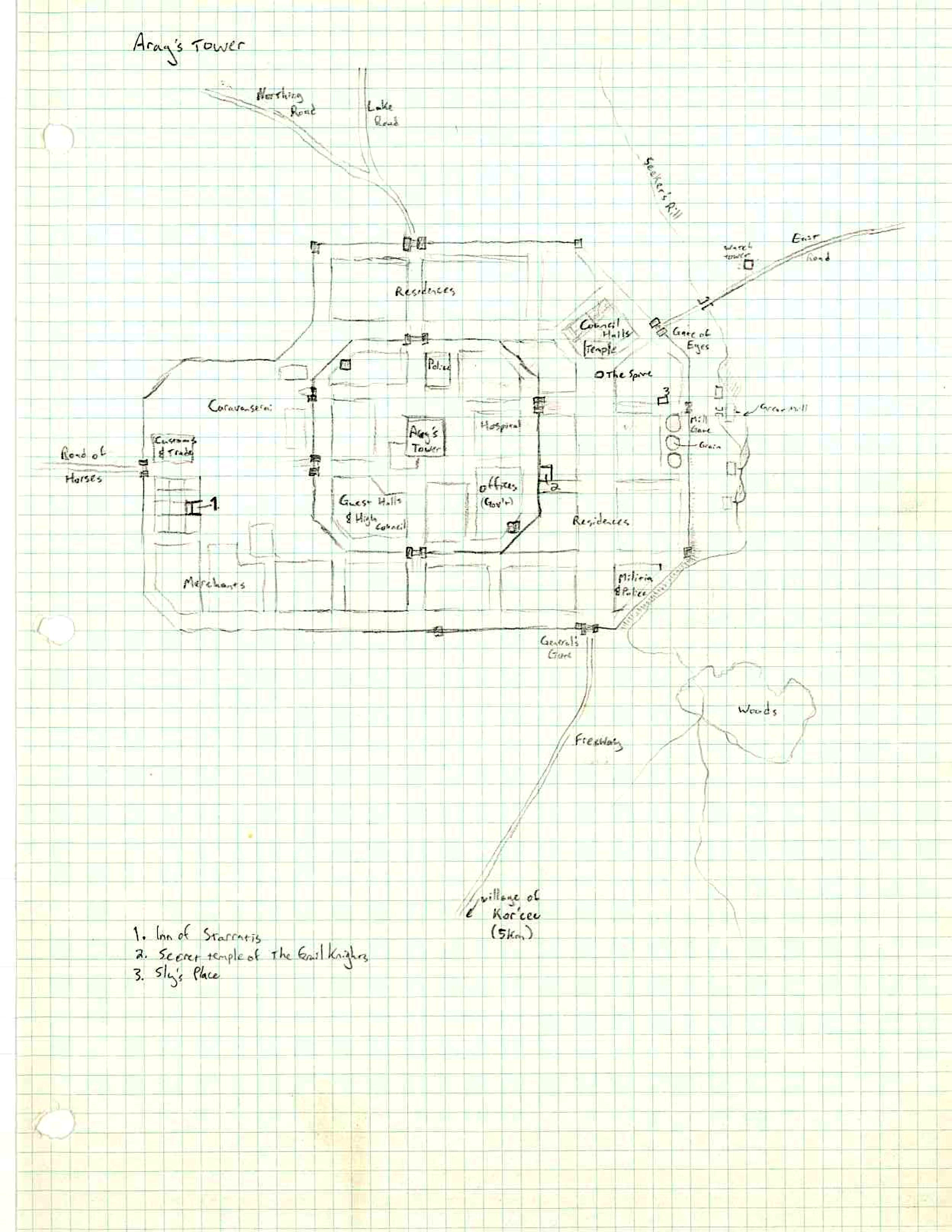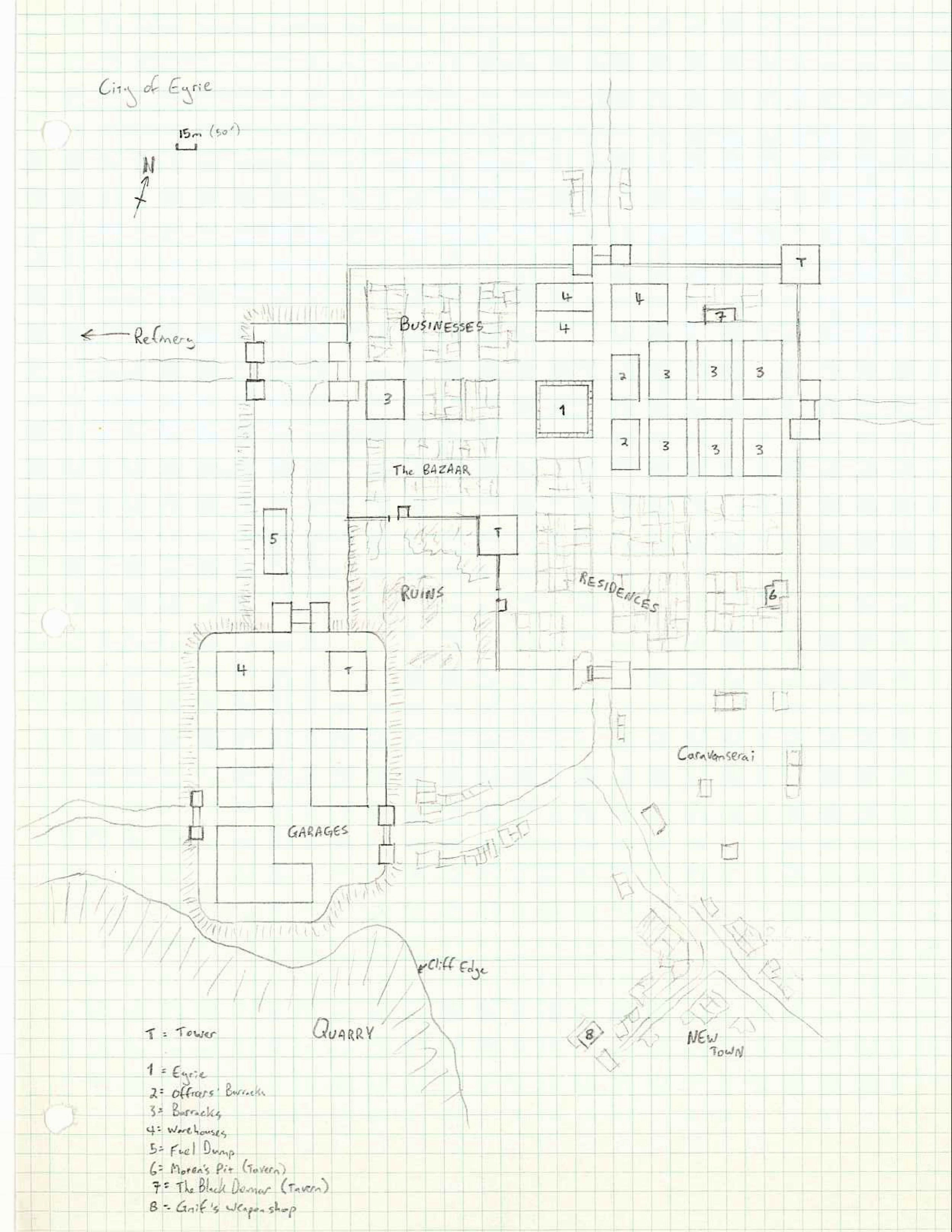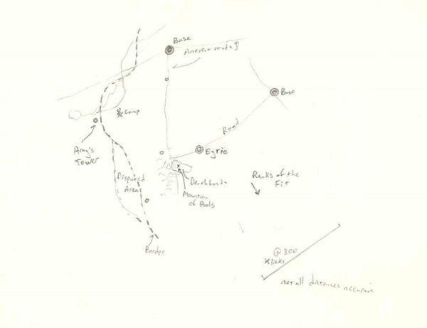 Despite their nomadic nature, Arag’s Tower has grown up in lands of the Death Groups as a semi-permanent camp that serves as a trading post and as a rallying point in the event of a larger external threat. In the campaign, the characters initially traveled there to make content with friendly members of the Death Groups they had met previously. Their travels took them east across the territories tracking rumors of Ancient technology that took them from installation to installation as they discovered an unknown group had allied itself with other known factions whose attitude towards the characters and their allies ranged from neutral to hostile. Ultimately, the campaign would have taken them to the foot of Rocky Mountains and to a confrontation with the group massing on the other side of that much-changed mountain range. Since it never did, that area remains unmapped and undescribed apart from some fragmentary pieces of a vertical city and yet another Ancient installation known as High Command.