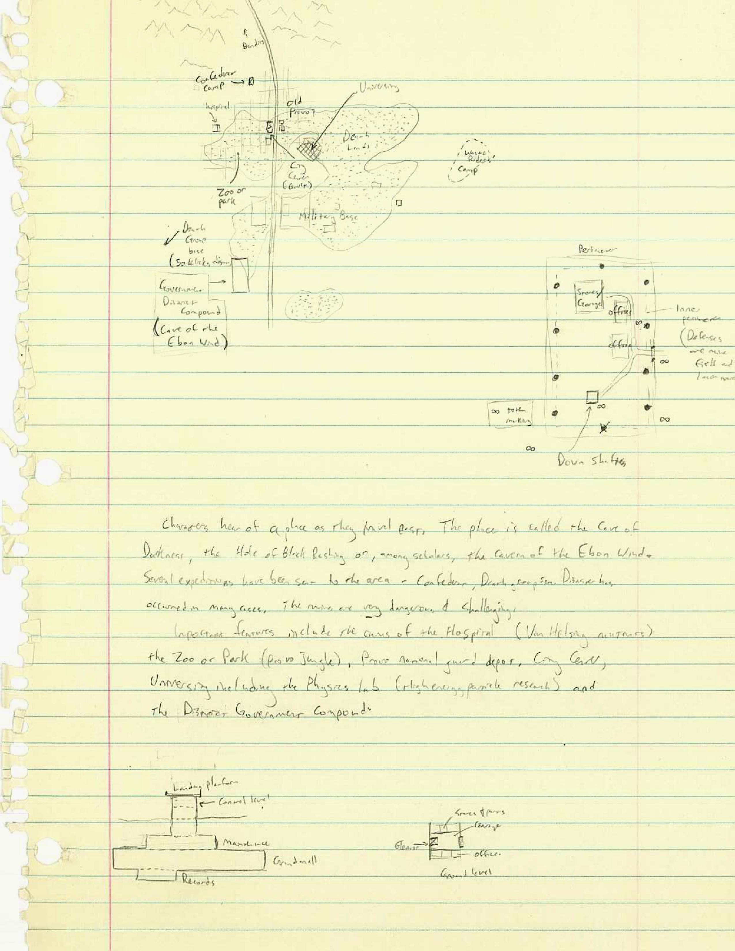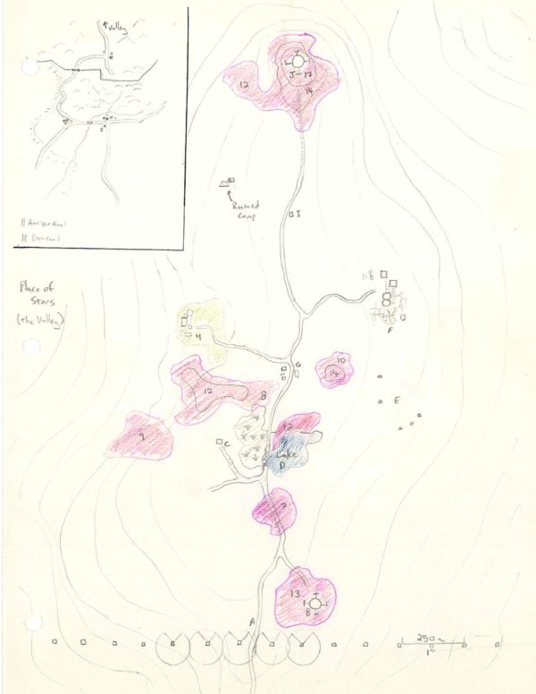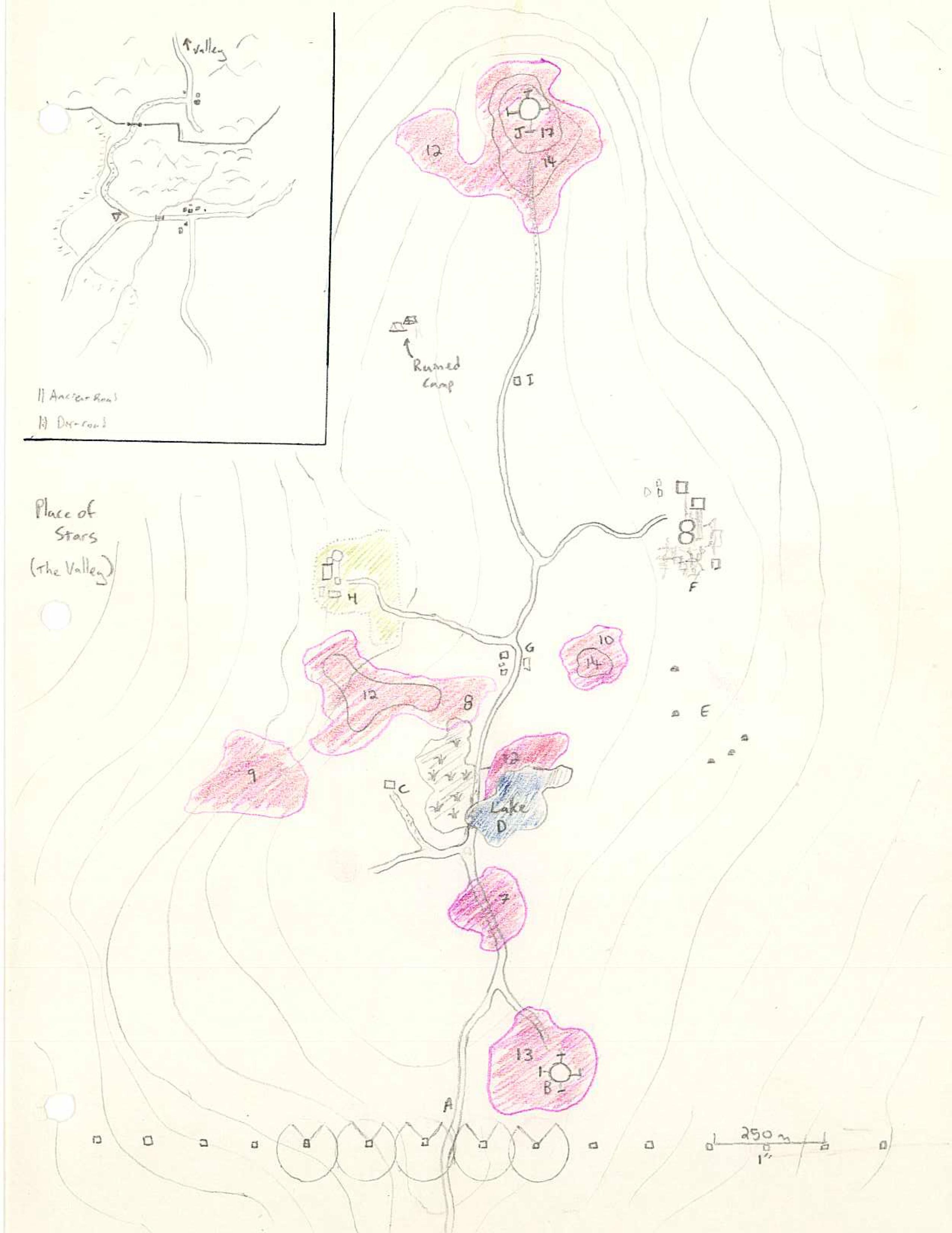 As mentioned in my previous post about a long-running Gamma World campaign, the maps increasingly became more detailed and linear to meet the needs of the game. This set of maps was pretty much the second phase of the campaign after the players had confronted the threat posed by the Unclean and turned their attention to the lands inhabited by the Death Groups, a combination of the nomadic aspects of the Red Death cryptic alliance (thus the name, but with the extermism subsumed by the group known as the Seekers of the Red Sword) and the willingness to live in radioactive areas like the Radioactivists (and thus having access to higher technology, like the Unclean, but with less infrastructure to take advantage of it, due to their nomadic society).
