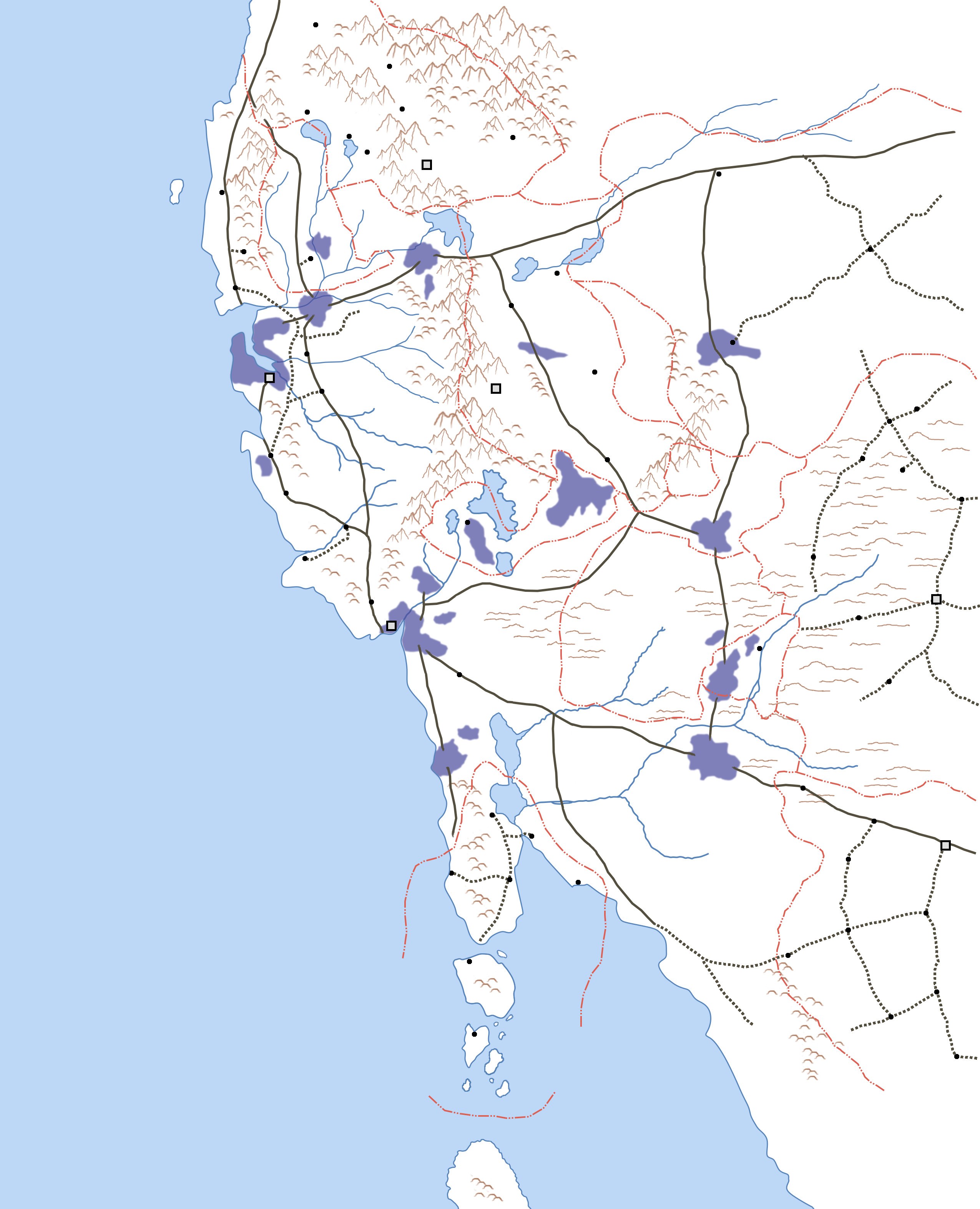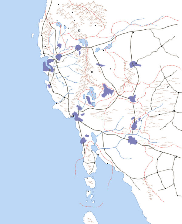 Here’s the work in progress, to which I plan to improve the political divisions, delineate the areas of influence of the Unclean, add labels to all the areas and locations, and provide useful map items like scale markers. I’d also like to add some items from the later detail maps I created for the campaign.