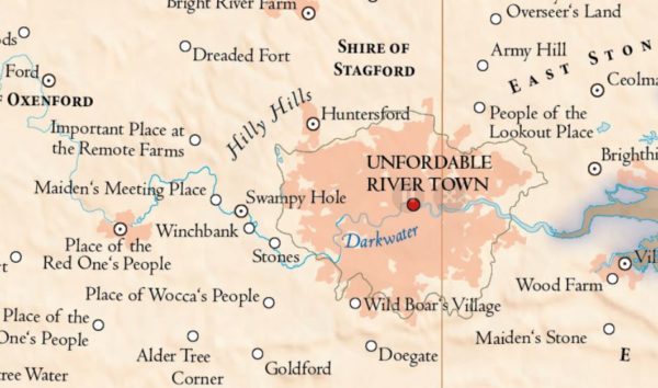 For those creating their own maps, there’s much more flexibility in the etymology of place names and the opportunity to play with the names while simultaneously developing the place names, cultures, history, and language of the area. Descriptive names are easy and incredibly common. Rivers are often named simply “River” such as England’s Thames, Tame, and Teme, and also Avon from a different root. The Atlas of True Names translates the Thames as Darkwater, but that seems more like over-etymologizing since the original root can be used to mean “dark” or “river”, implying that it would be more like a river in the sense of a dark and deep-flowing body of water, much like brook and torrent describe two very different types of streams. Other rivers are simply “river” with the addition of an adjective, such as Mississippi derived from the Ojibwe misi-ziibi (“great river”) or Tolkien’s Anduin and Brandywine (Baranduin).