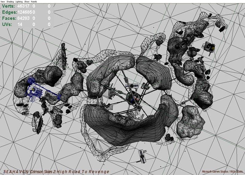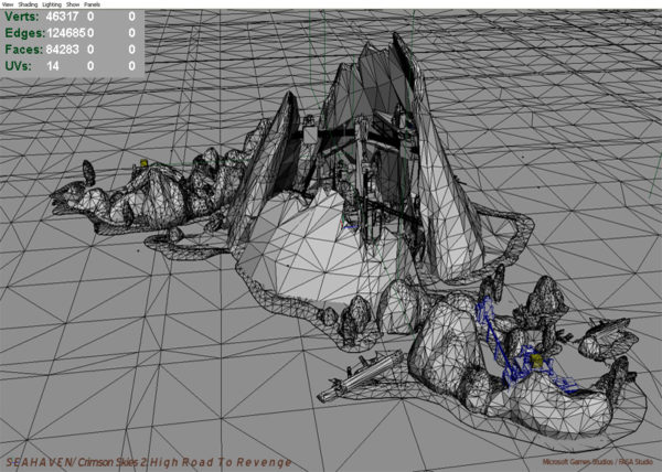 Knowing what I know after having worked on the game, I’d add much more vertical elements to the game, exaggerating the depth of the river valley and break up the valley walls with ravines, add bluffs of varying heights, and increase the number of buildings. One of the areas in Crimson Skies: High Road to Revenge, the outlaw base of Sea Haven, was a caldera with exaggerated vertical scale with an exterior littered with the wreckage of zeppelins and an interior criss-crossed with walkways and girders. All of it made for interesting missions along with plenty of out-of-the-way places to hide tokens. Interestingly, the game was originally conceived with multi-modal play where the player would occasionally exit their plane and run around. When that idea was scrapped, there was no need for detailed human-scale areas and focus was given almost entirely to levels playable with airplanes apart from the gameplay around manning turrets.
