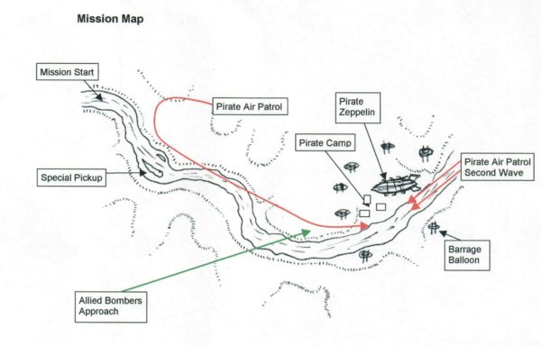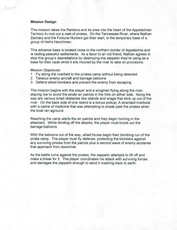 When I applied for my first game designer with Microsoft Games Studio, part of the application involved answering a series of questions about game design and called for the design of a sample Crimson Skies level. The idea was to build a simple (1 page) mission in the current Crimson Skies universe, limiting it to the weapons and planes in that setting. What I came up with was a raid in Appalachian Territory in order to clear the way for a bombing run on a band of Hell’s Henchmen.