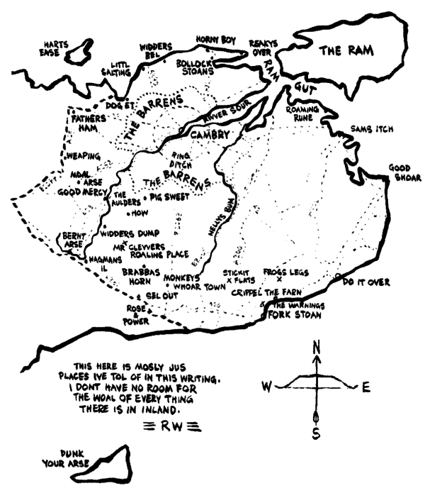 The first map is of Kent during the Roman occupation (and also covering Sussex, Surrey, and neighboring areas) that shows the extent of The Weald at that time (also known as Coit or Coed Andred, Silva Anderidae, or Andred’s Wood). Very little remains now apart from small forests like Ashdown Forest at the center of the High Weald and, incidentally, the basis for the setting of Winnie the Pooh stories. The second map is a postcard map of modern Kent (via Alwyn Ladell) that shows The Weald in the lower left. The third map is a future England as imagined by Russell Hoban for his book, Riddley Walker where the place names combine language drift and folk etymologies (or “eggcorns”). The place names are still recognizable in all three despite the changes in name over time.