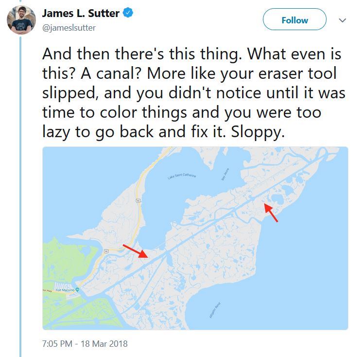 Truth is always stranger than fiction and never more so than when looking at maps of places that have been touched by human hands. Filling swamps for warehouses and dredging of rivers for the passage of boats, as just one example, results in highly regular looking waterways and coastlines. Which is why a recent Twitter thread by James L. Sutter about New Orleans is so entertaining. The canal he points out particularly caught my attention because it’s such an absurd feature, but it’s part of a set of features that constitute the Gulf Intracoastal Waterway and it joins up with the Industrial Canal and the Mississippi River-Gulf Outlet Canal (MRGO), where all three waterways allow traffic between Lake Ponchartrain and different parts of the Gulf.